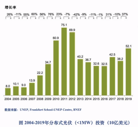 2019年中國(guó)太陽(yáng)能領(lǐng)域投資下降33%, 至257億美元,為2012年最低水平,新增規(guī)模放緩,容量單位投資下降是主因。日本光伏投資繼續(xù)小幅下降7%至136億美元。韓國(guó)太陽(yáng)能發(fā)電中75%是1MW以下的分布式光伏項(xiàng)目。