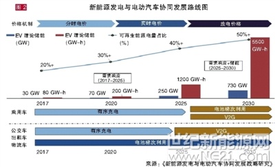 值得注意的是,《報(bào)告》發(fā)布了新能源發(fā)電與電動(dòng)汽車(chē)協(xié)同發(fā)展路線圖(如圖2)?!叭鐖D所示,可再生能源發(fā)電量占比將從目前25%提升至50%以上,電動(dòng)汽車(chē)儲(chǔ)能理論潛力也將從目前的30GW-100GWh提升至700GW-3800GWh?!眲?jiān)強(qiáng)調(diào),在不同時(shí)段引入合理的價(jià)格機(jī)制和并網(wǎng)模式是發(fā)掘電動(dòng)汽車(chē)儲(chǔ)能潛力的關(guān)鍵。